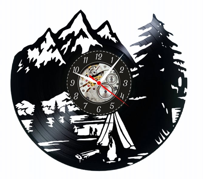 Ceasul nostru „Camping” este decorat cu motive care evocă frumusețea naturii: munți, copaci și simboluri ale activităților în aer liber. Fiecare detaliu este atent realizat, aducând la viață atmosfera unei escapade în natură. Culoarea neagră a discului de vinil contrastează perfect cu nuanțele calde ale temei campingului, creând un efect vizual captivant.
