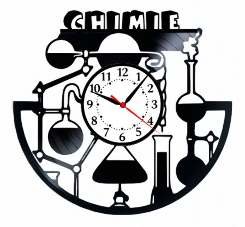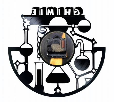 Descoperiți magia științei transformată în artă cu ceasul nostru de perete “CHIMIE” – o piesă unică, creată manual dintr-un disc de vinil vintage.