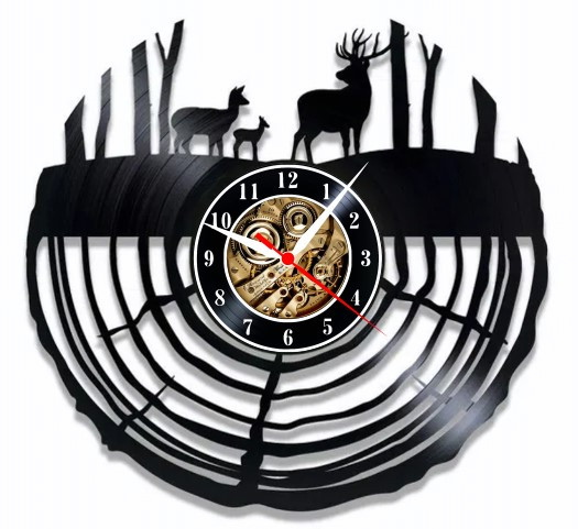 Acest ceas unic îmbină într-un mod armonios funcționalitatea cu designul artistic. Pe suprafața neagră lucioasă a discului de vinil, o familie de cerbi a prins viață prin tehnici artizanale de tăiere și gravare. Siluetele elegante ale cerbilor, redate cu atenție la detalii, creează o scenă pitorească ce evocă liniștea și frumusețea pădurii.