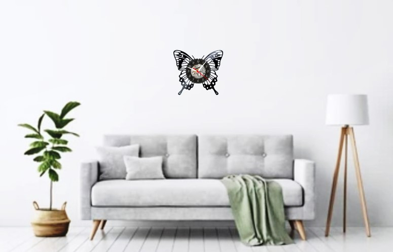 Designul spectaculos prezintă un fluture maiestuos, ale cărui aripi negre, decupate cu precizie din vinilul original, încadrează perfect cadranul central. Aripile fluturelui, cu modelul lor intricate și tăieturile delicate, creează un contrast dramatic cu mecanismul expus al ceasului.