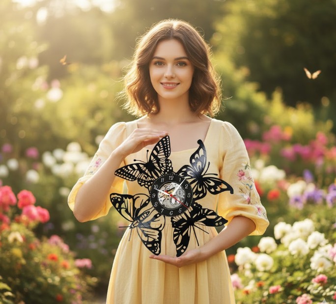 Acest ceas de perete artizanal reprezintă o metamorfoză artistică a unui disc de vinil în care fluturi delicați par să prindă viață, dansând într-un zbor grațios pe suprafața lucioasă a vinilului. Fiecare fluture este minuțios decupat manual, creând un contrast dramatic cu fondul negru al discului.