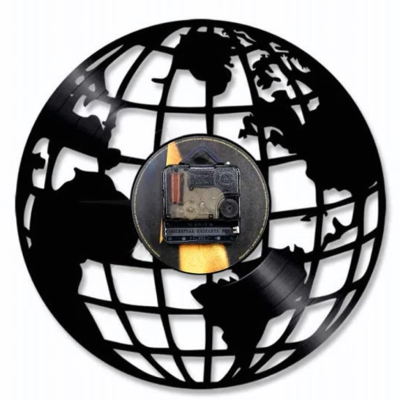 Acest ceas remarcabil este creat manual dintr-un disc de vinil autentic, transformat cu măiestrie într-o reprezentare artistică a globului pământesc.